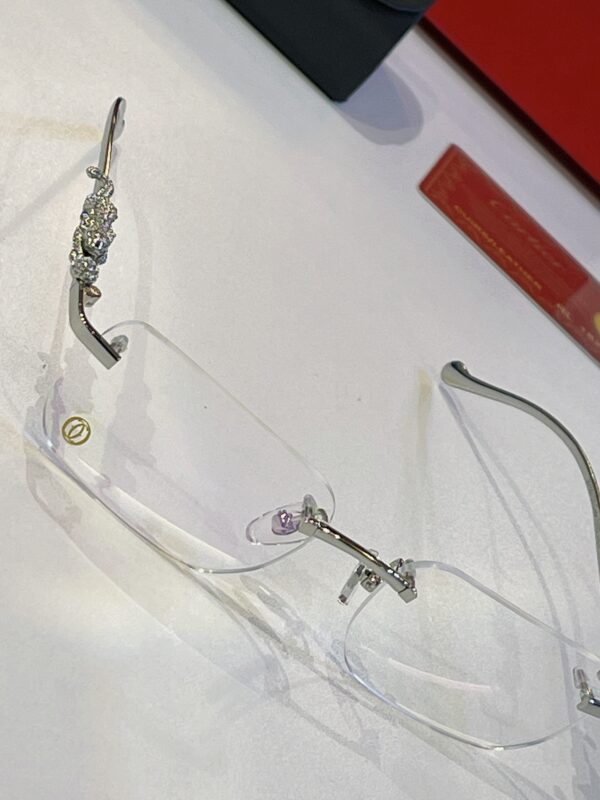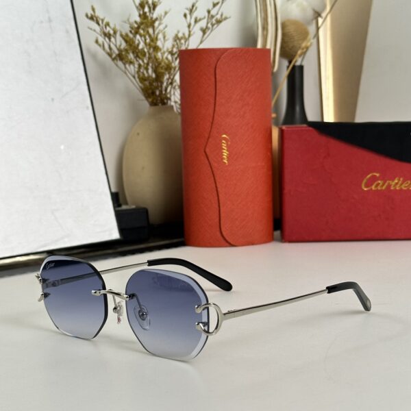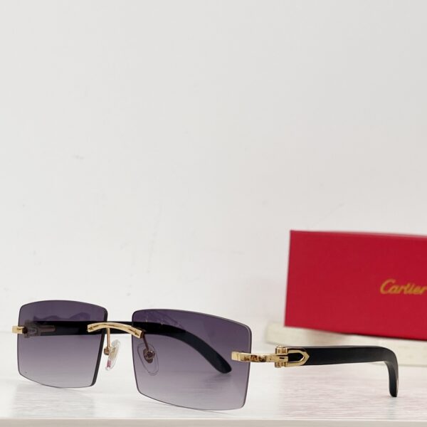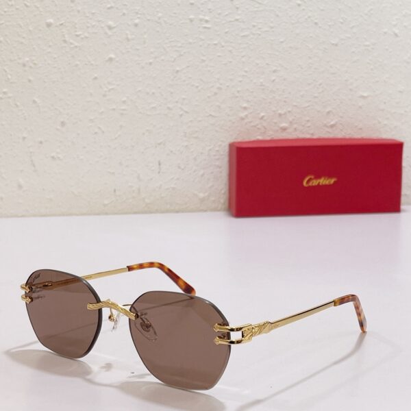 Les lunettes de soleil sans cadre Cartier CT0035RS offrent une esthétique élégante avec des branches en forme de fer à cheval et un logo gravé en profonde…